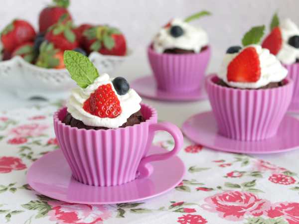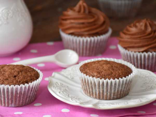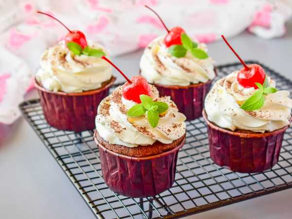 Капкейки выпекаем около 20-25 минут в заранее разогретой до 180 градусов духовке. Готовые капкейки охладим. Затем в капкейках удобным способом вырезаем небольшие выемки, которые можно заполнить кремом, джемом. Я положила в эти выемки по одной вишенке без косточек.