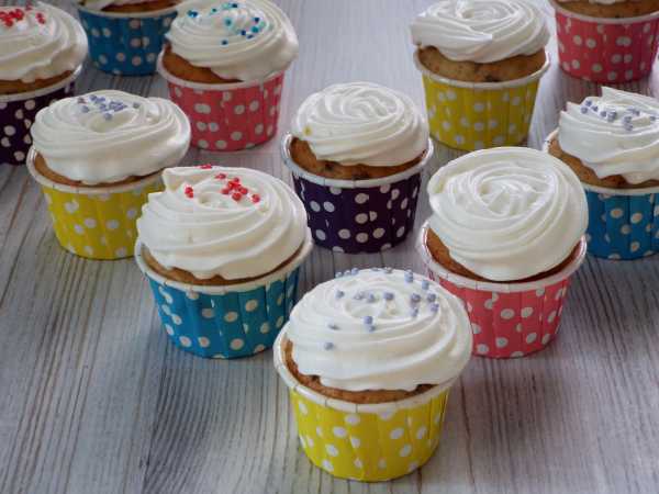 Затем белый крем выкладываем в один кондитерский мешок, черный крем выкладываем в другой кондитерский мешок. В третий кондитерский мешок с насадкой "Звездочка" помещаем два этих пакета с разноцветными кремами, предварительно отрезав у них кончики. Отсаживаем черно-белый крем на капкейки. Затем черно-белые капкейки можно сразу же подавать их к столу. Я еще украсила верхушки шапочек вишенками без косточек. Приятного аппетита!