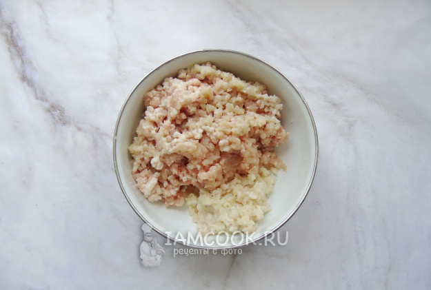 Приготовьте фарш для тефтелей. Можно взять любое мясо, у меня курица со свининой. Репчатый лук и чеснок очистите, помойте. Пропустите через мясорубку мясо, лук и чеснок.