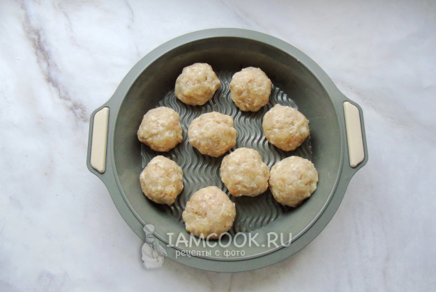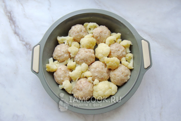 Цветную капусту отварите в подсоленной воде до полуготовности. Из фарша сформируйте тефтели и выложите в форму для запекания.
