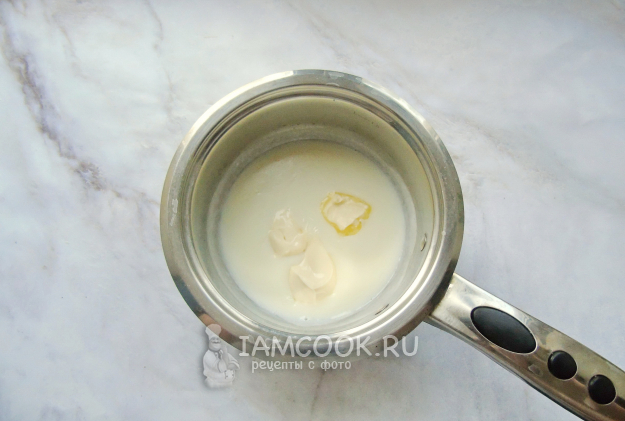 Приготовьте сырный соус. В небольшом количестве холодного молока размешайте муку. Налейте молоко в кастрюлю с толстым дном, добавьте молоко с мукой. Проварите до загустения, перемешивая венчиком. После добавьте сливочное масло и мягкий плавленый сыр из баночки. Посолите, добавьте мускатный орех. Перемешайте до полного растворения.
