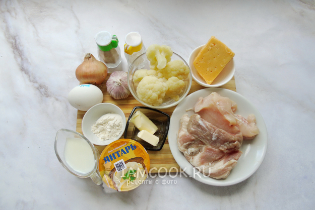 Соберите ингредиенты для приготовления тефтелей с цветной капустой в духовке (в сырном соусе).