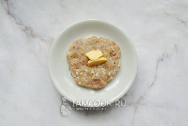 На порцию фарша выложите кусочек твердого сливочного масла.