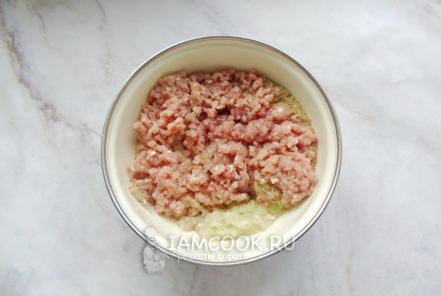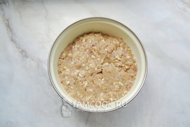 Приготовьте фарш для котлет. Пропустите через мясорубку куриное филе, мякоть свинины, лук, чеснок и батон. Белый батон или булку предварительно залейте холодной кипяченой водой и через несколько минут отожмите.
