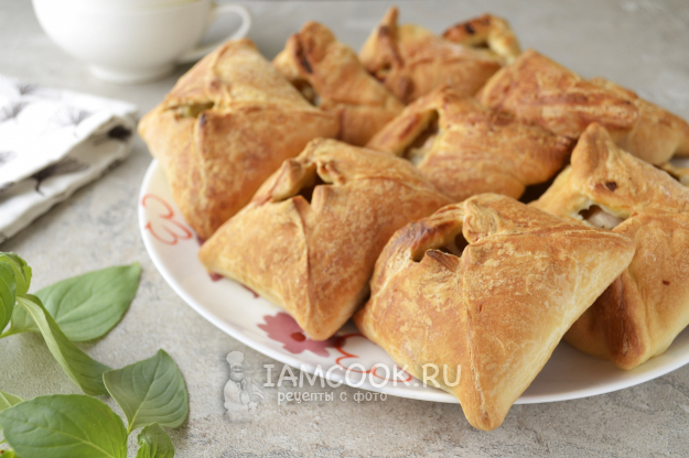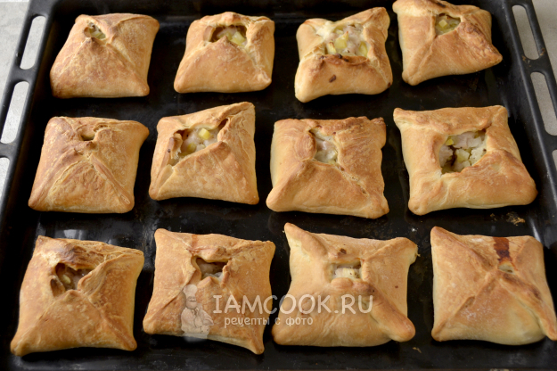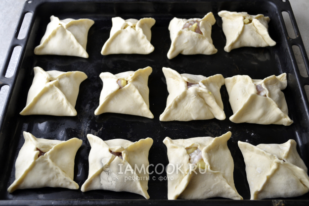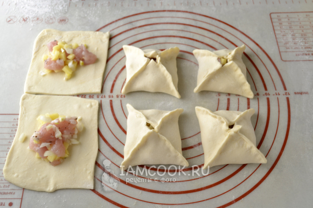 В центр каждого квадрата положите по полной столовой ложке куриной начинки. Соедините углы квадратов вверху, защипните края, оставьте небольшую дырочку для выхода пара во время выпечки. Таким же способом сделайте заготовки из второго пласта теста.