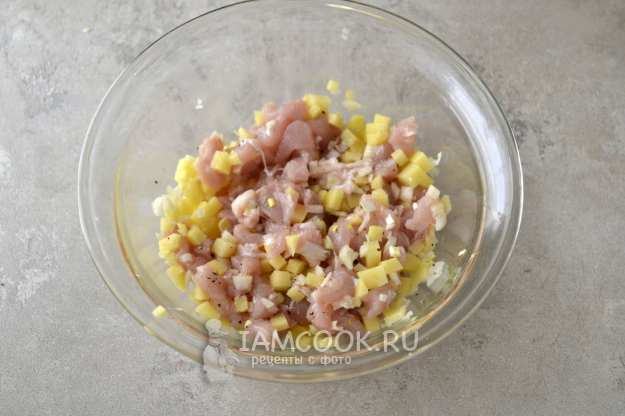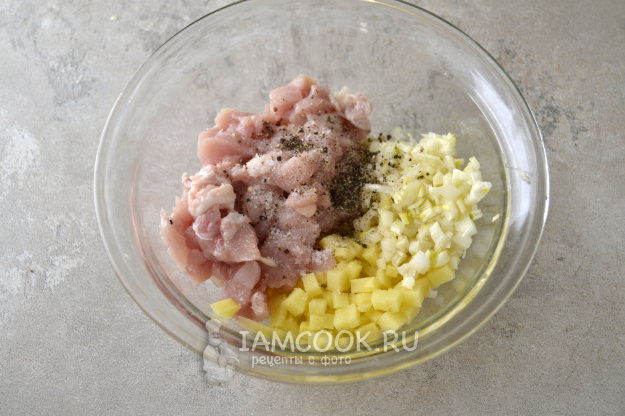 В глубокую миску положите нарезанную на мелкие кубики куриную грудку, нарезанные на еще более мелкие кубики картофель и лук. Посолите и поперчите.