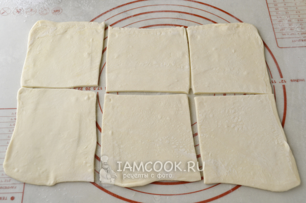Посыпьте стол мукой и раскатайте пласт слоеного теста в прямоугольник. Разрежьте его на квадраты.