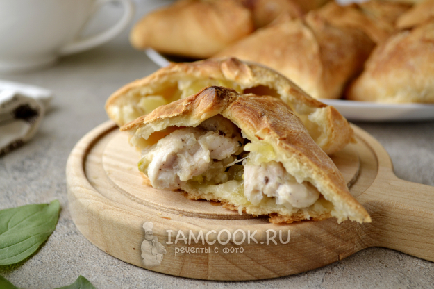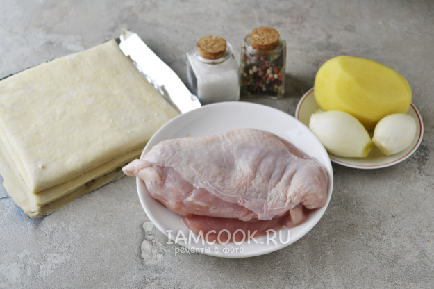 Продукты для приготовления мини-курников из слоеного теста с курицей и картошкой - перед вами. Тесто заранее достаньте из морозильной камеры, чтобы медленно оттаяло. Картошку и лук почистите.
