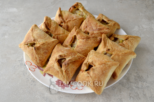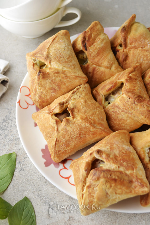 Выпекайте мини-курники из слоеного теста в предварительно разогретой до 190°С духовке в течение 25-30 минут. Время выпекания будет зависеть от особенностей вашей духовки. Чтобы не подгорели курники, под противень можно поставить емкость с водой, а сверху прикрыть пекарской бумагой.