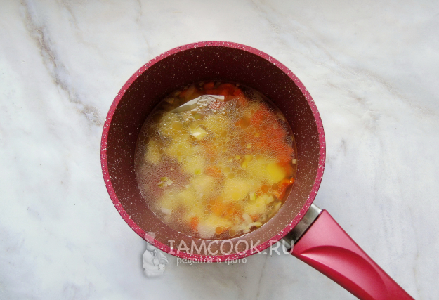 Налейте в кастрюлю воду или бульон. Поставьте на плиту и варите овощи почти до готовности.