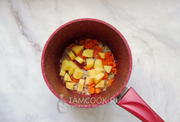 Картофель очистите, помойте и нарежьте, добавьте в кастрюлю с морковью и луком.