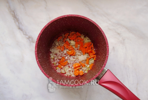 Морковь и лук очистите, помойте и нарежьте произвольно. Выложите в кастрюлю с толстым дном или в сковороду. Налейте 30-40 мл растительного масла и пассеруйте овощи 7-8 минут на небольшом огне.