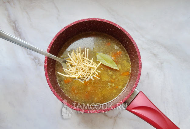 После выложите в кастрюлю с супом. Посолите, поперчите, варите суп с печенью 5 минут. Затем добавьте лапшу и лавровый лист.