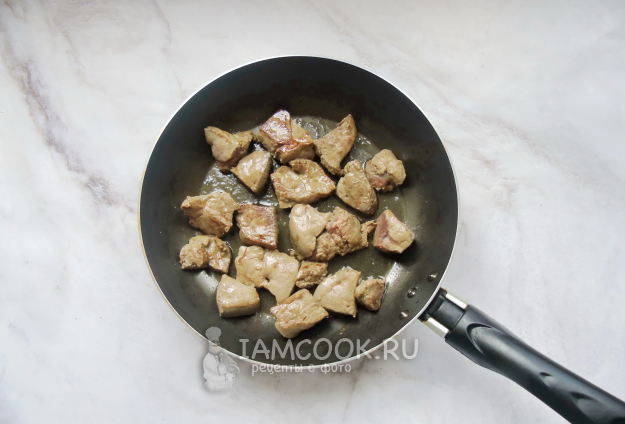 Тем временем говяжью печень помойте, очистите от пленки и протоков. Мелко нарежьте, выложите в сковороду, налейте подсолнечное масло и обжарьте по всех сторон до полуготовности.