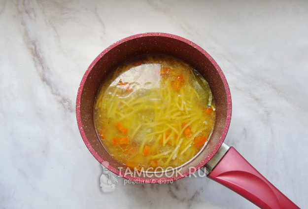 Когда суп с лапшой закипит, варите его еще 5-6 минут и выключайте. Если ваша лапша готовится дольше - варите до её готовности.
