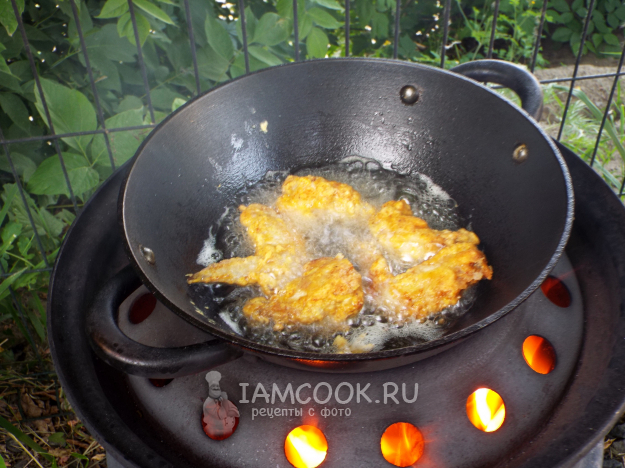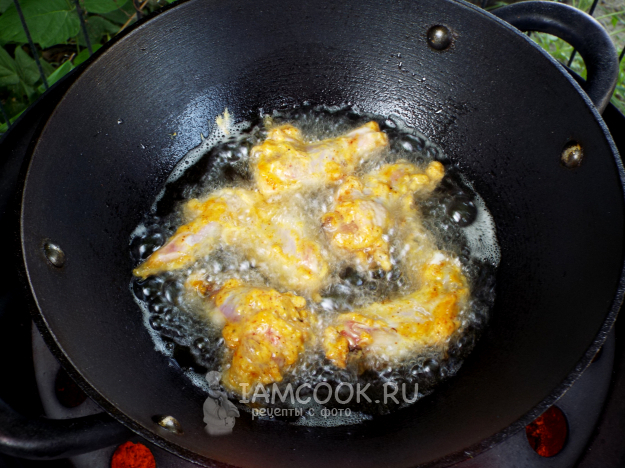 Жарить куриные крылышки в казане на костре партиями в один слой.