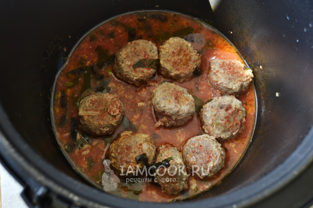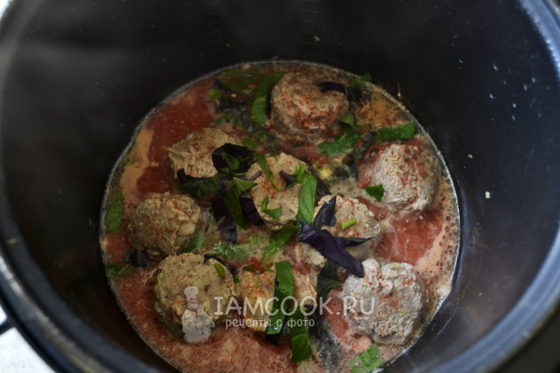 Переключите на режим "Тушение". Готовьте фрикадельки в томатном соусе в мультиварке 30 минут. За несколько минут до окончания программы положите в чашу нарезанный свежий базилик.