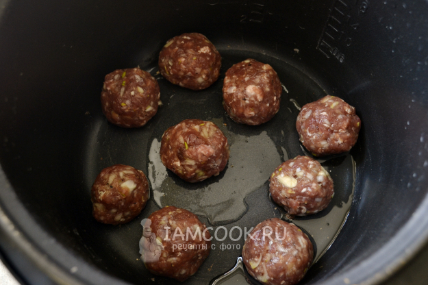 Влейте в чашу мультиварки растительное масло. Включите режим "Жарка". Когда масло разогреется, положите в чашу фрикадельки.