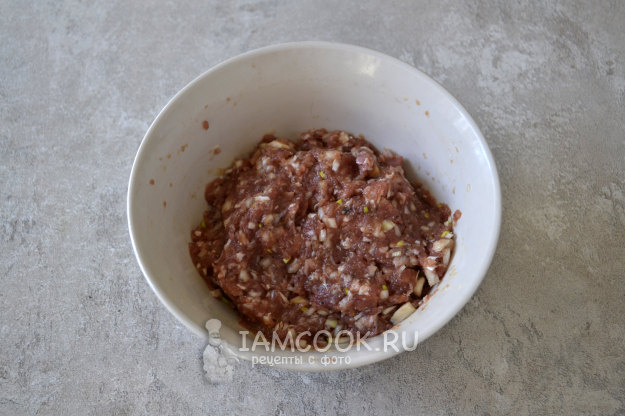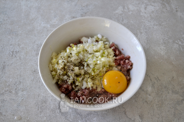 В глубокую миску положите мясной фарш, мелко нарезанный репчатый лук, разбейте яйцо, соль и черный молотый перец.