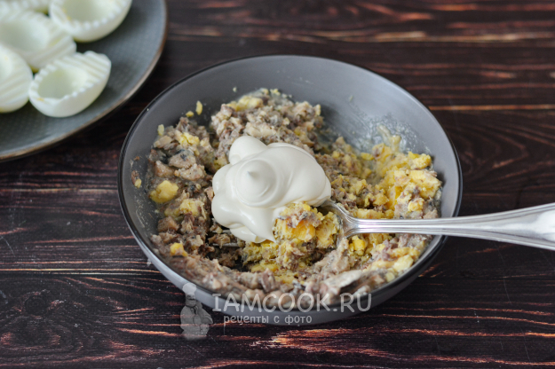 Разомните вилкой рыбу и желтки, добавьте по вкусу майонез.