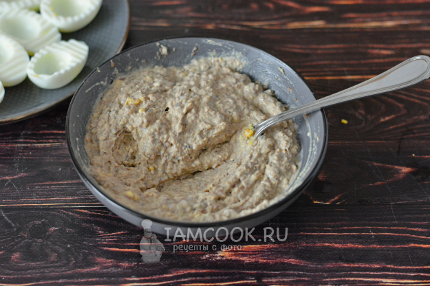 Всё перемешайте до однородности. Начинка для фарширования яиц готова.