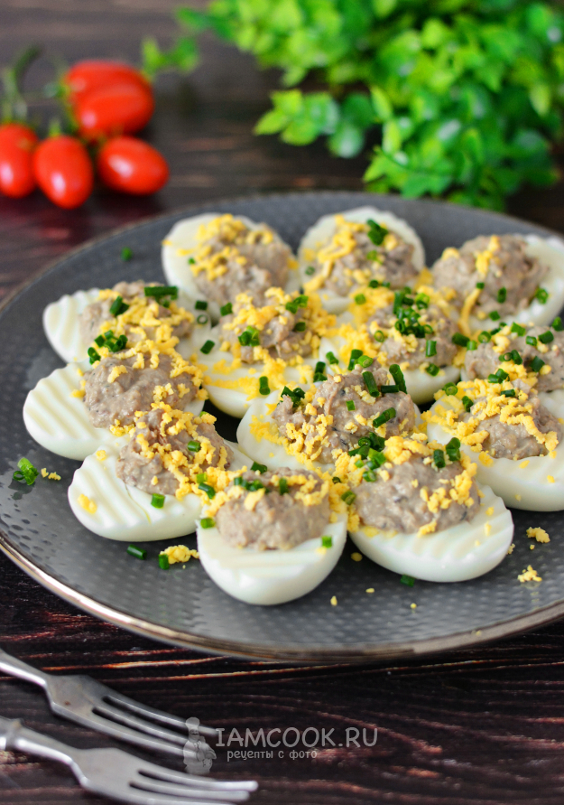 Фаршированные яйца с рыбными консервами готовы! Посыпьте их нарезанным зеленым луком и подавайте сразу!