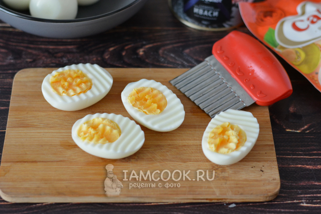 Без ложной скромности скажу, что при таком способе варки яйца получаются идеальными. Разрежьте их на половинки.