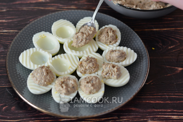 Наполните половинки яичных белков при помощи чайной ложки получившейся начинкой. По опыту скажу, что на одну стандартную банку рыбных консервов уходит примерно 7-10 яиц.