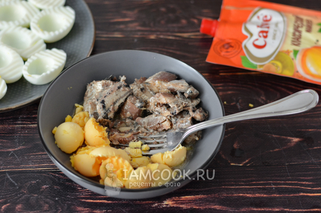 Аккуратно выньте желтки, один желток оставьте на украшение. С рыбных консервов слейте жидкость и соедините их в миске с вареными желтками.