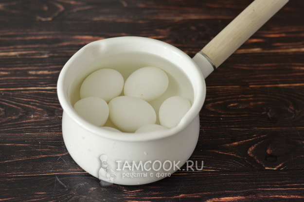 1. Яйца моем, заливаем холодной водой, доводим до кипения и убавляем огонь до минимума. Варим 5 минут. Очень важно варить на малом огне - так яйца не потрескаются.