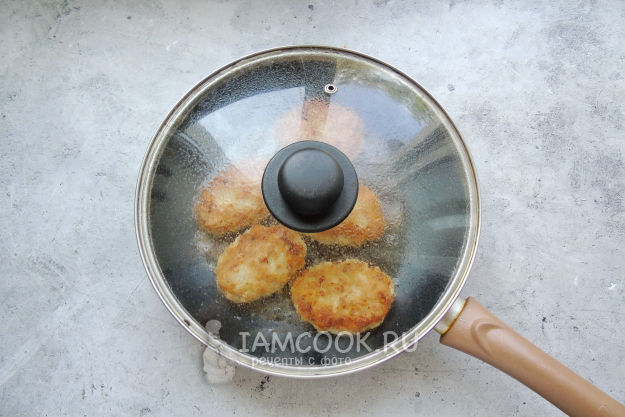Жарьте котлеты с одной стороны до золотистого цвета на огне чуть ниже среднего. Затем переверните на другую сторону, огонь немного убавьте, накройте сковороду крышкой и доведите котлеты до готовности.