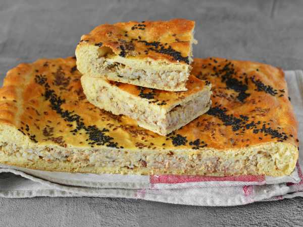 Выпекайте рыбный пирог с терпугом в духовке при температуре 150-160°С около 40 минут. Затем можно увеличить температуру, чтобы подрумянить пирог.