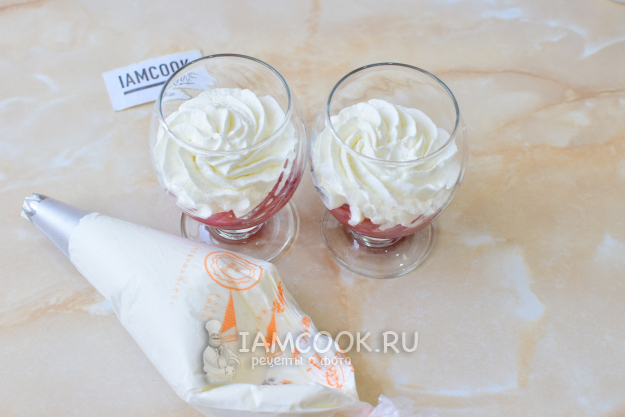 В чаше для взбивания соедините сливки жирностью 33-35% с сахарной пудрой. Взбейте крем до пышной массы.