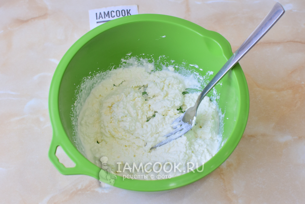 Творог разомните вилкой. Он должен быть влажным и сочным. Для однородности протрите творог через сито.
