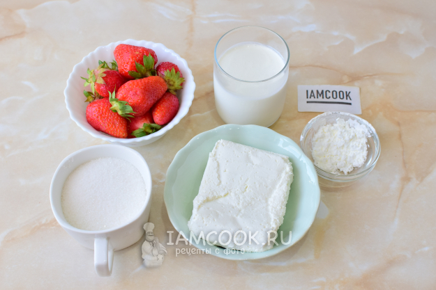 Продукты для творожного десерта с клубникой подготовьте по списку. В начинку можно использовать и замороженные ягоды клубники. А на украшение берите свежие.