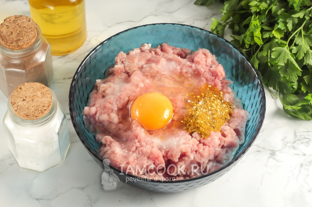 Выложите мясной фарш в глубокую емкость, вбейте куриное яйцо, всыпьте приправу, соль и молотый черный перец. Натрите на терке с мелкими ячейками очищенный репчатый лук. По желанию можно добавить и очищенный зубчик чеснока, спрессовав его или натерев вместе с луком. Тщательно вымешайте фарш. Допустимо приготовить его и без добавления куриного яйца, но тогда фарш нужно отлично отбить - до белых сальных нитей, чтобы из него удалить все пузырьки воздуха.