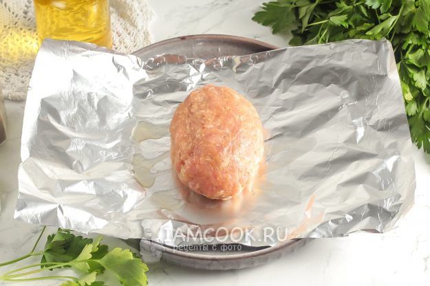 Нарежьте фольгу на равные прямоугольники. На каждый влейте немного растительного масла. Разделите фарш на равные части и округлите их в руках. Приготовьте заготовки котлет и выложите их на фольгу, обмажьте маслом. Оберните фольгу вокруг котлет.