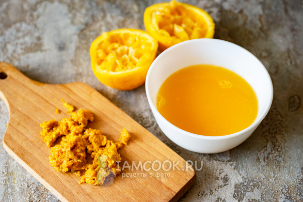 Сначала займемся апельсиновым соусом. С двух апельсинов снимем цедру с помощью мелкой терки, а затем из этих двух апельсинов выдавим сок, избавляясь от косточек - у меня получилось примерно 200-230 мл.