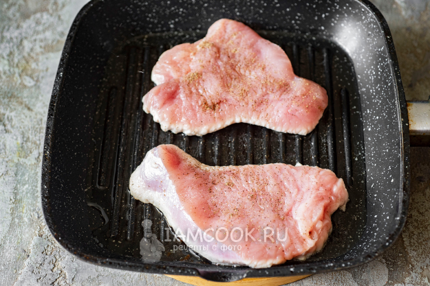 Дно сковороды смажем растительным маслом, поставим на максимальный огонь, выложим стейки индейки, сверху посолим, поперчим. Будем обжаривать на максимальном огне с двух сторон до появления аппетитной золотистой корочки - это примерно по 3 минуты на одну сторону.