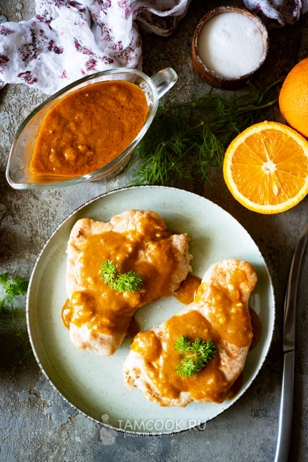 Подаём филе индейки в апельсиновом соусе так: горячую индейку выложим на тарелки и польем обильно апельсиновым соусом. Приятного аппетита!
