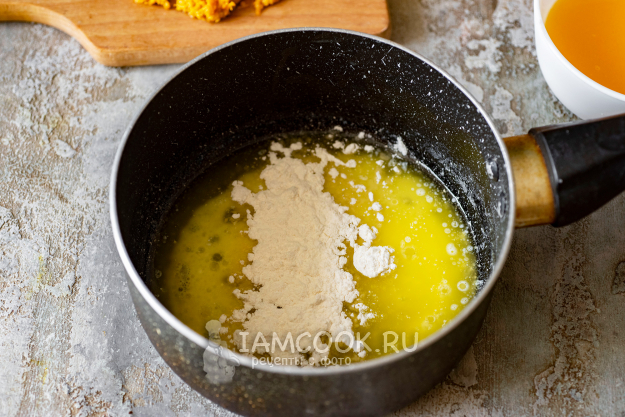 В сотейнике на маленьком огне растопим сливочное масло и выложим к нему муку. Активно помешивая венчиком и избавляясь от мучных комочков, подержим на маленьком огне эти ингредиенты примерно 3 минуты.