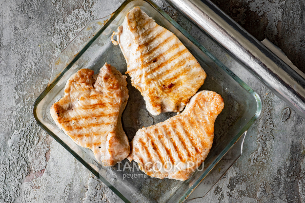 Дно формы для запекания смажем растительным маслом и выложим обжаренные стейки, форму накроем фольгой, отправим в разогретую до 180 градусов духовку на 20 минут.