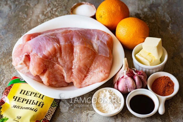 Соберём необходимые ингредиенты для приготовления индейки в апельсиновом соусе. У меня филе весом в 1 кг, поэтому для рецепта я отрезала 3 стейка толщиной в 2 см, можно отрезать и больше - это по желанию. Предварительно филе я ополоснула и просушила бумажными полотенцами. Апельсины очень тщательно помоем под горячей водой, так как нам потребуется снять цедру. Чеснок почистим.