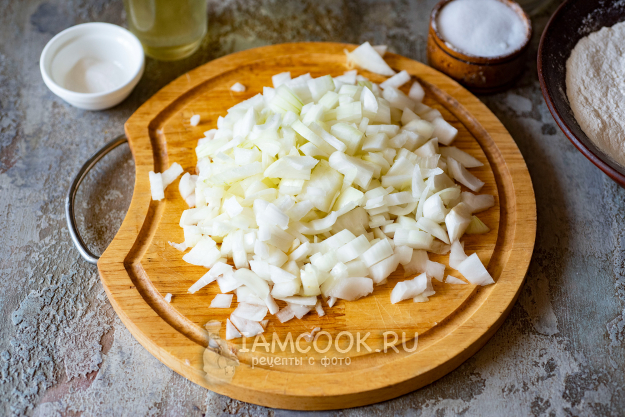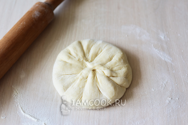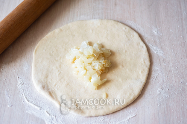 Рабочую поверхность присыплем мукой и раскатаем одну часть в тонкую лепешку. В центр этой лепешки выложим 1/4 часть обжаренного лука.