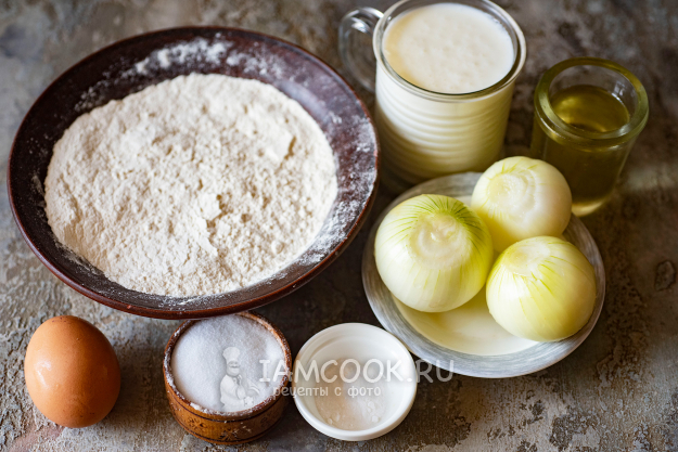 Соберём необходимые ингредиенты для приготовления жареных луковых лепешек на кефире на сковороде. Луковицы почистим.