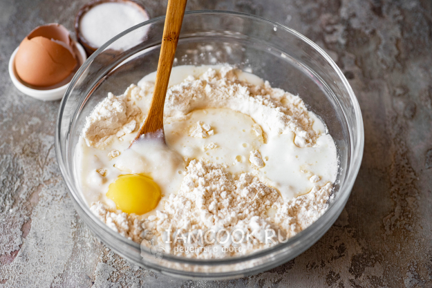 Приготовим тесто. В миску всыплем всю муку, зальем кефир, вобьем яйцо, добавим соль и соду.