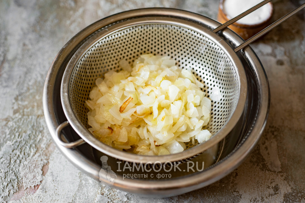 Обжаренный лук откинем на сито, чтобы избавиться от излишков масла.