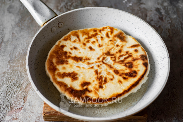 В сковороде разогреем 3 ст.л. растительного масла, выложим лепешку и на небольшом огне обжарим лепешку сначала с одной стороны до золотистой корочки.
