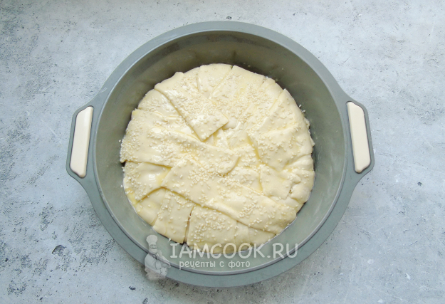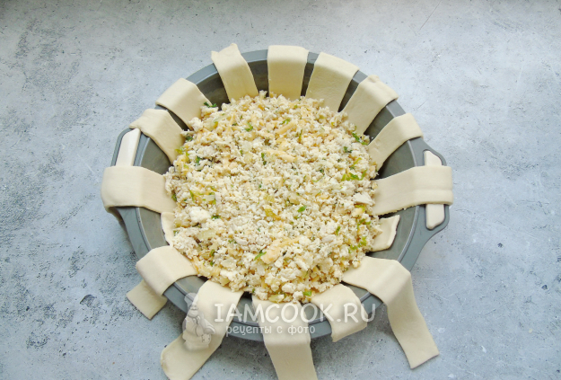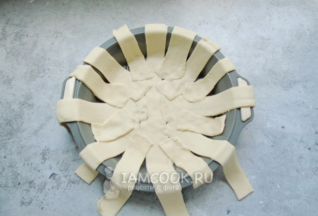 Слоеное тесто разморозьте, раскатайте и нарежьте полосками. Выложите полоски теста в форму для выпечки, смазанную маслом.