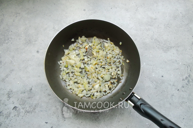 Репчатый лук очистите, помойте, мелко нарежьте и поджарьте на сковороде в подсолнечном масле.